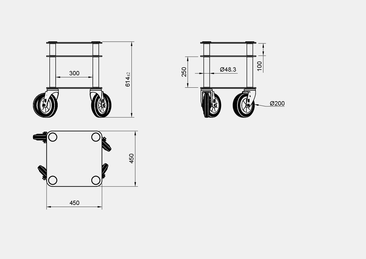 Il supporto delle ruote è in acciaio zincato con verniciatura epossidica nera ad alta resistenza.