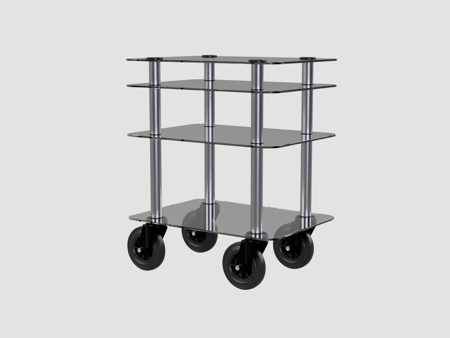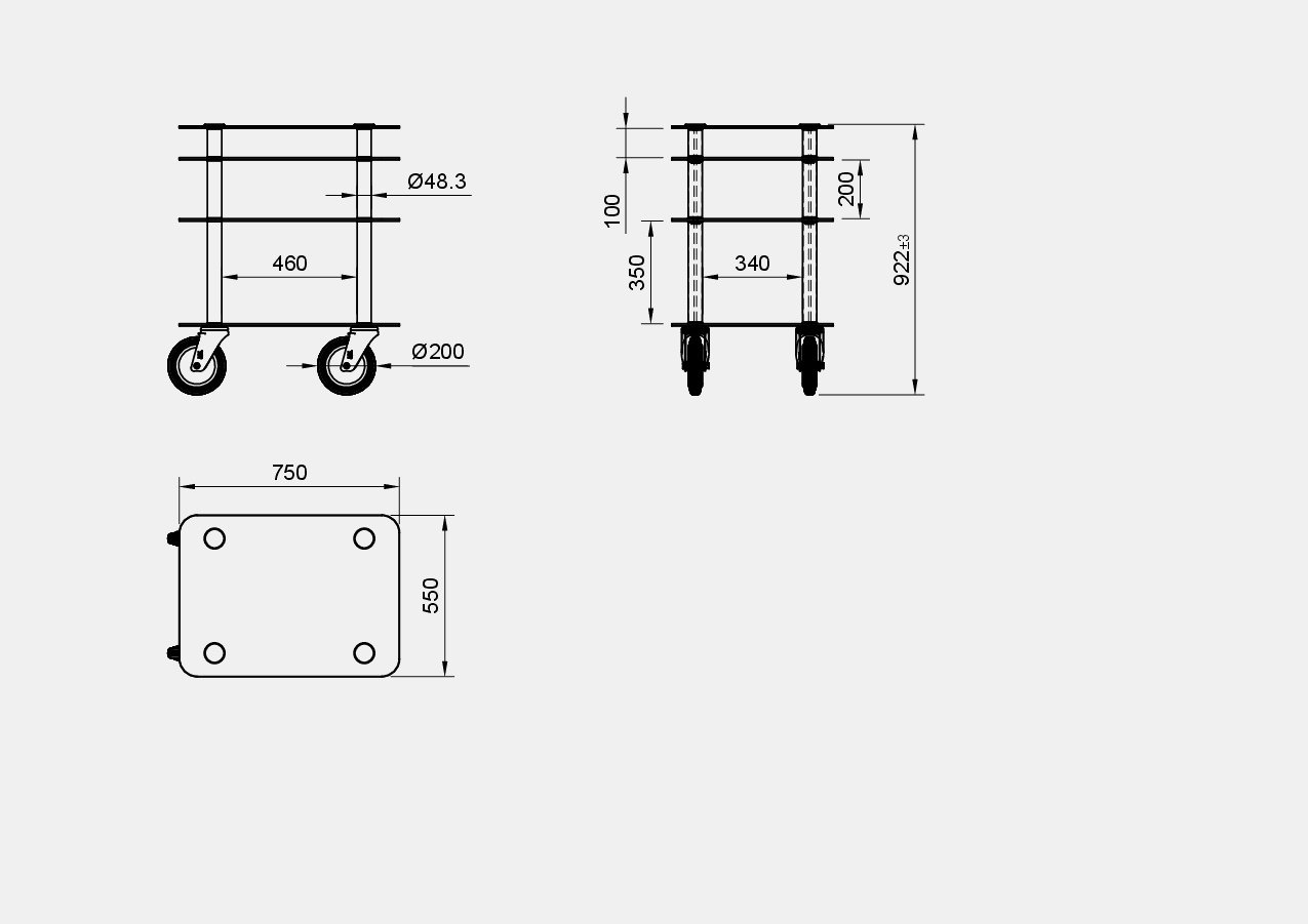 La struttura con tubi in acciaio inox AISI 304 satinato è sostenuta da 4 ruote piroettanti in gomma.
