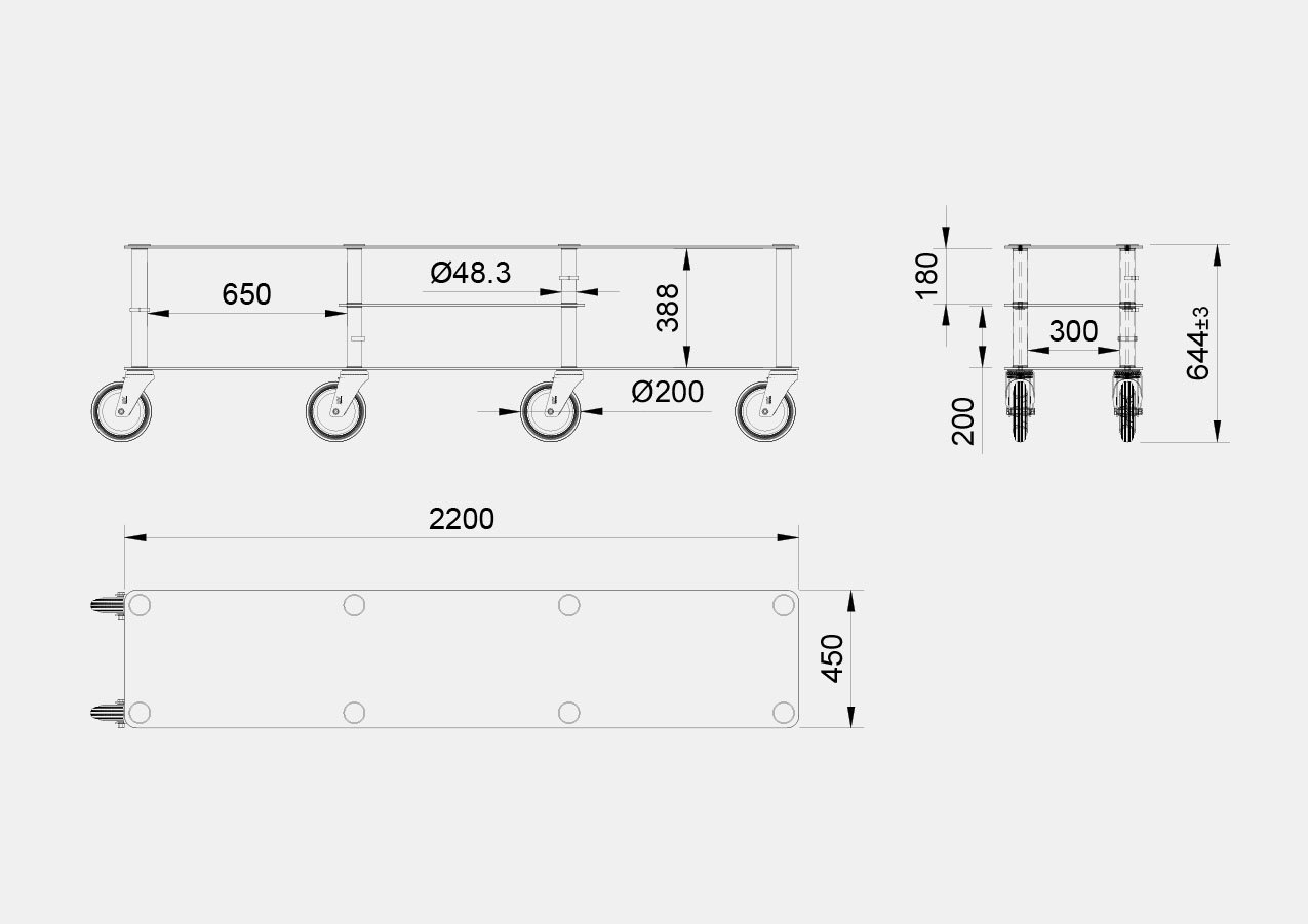 La struttura con tubi in acciaio inox AISI 304 satinato è sostenuta da 4 ruote piroettanti in gomma.